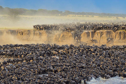 September sees the herds spread out across the northern Serengeti, where the Mara River provides the migration with its most serious obstacle. This river gushes through the northern Serengeti from Kenya’s adjacent Maasai Mara Game Reserve. Watching the frantic herds of the wildebeest migration crossing the Mara River can be very spectacular; there are often scenes of great panic and confusion. It’s common to see herds cross the Mara River north on one day, and then back south a few days later.